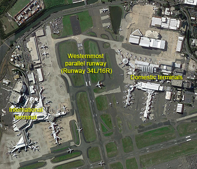 The proximity of the terminals to the runway at northern end of Sydney Airport means there is limited space on the taxiways for queuing. Below right: There is much more room for queuing aircraft on the taxiways at the southern end of the Airport.